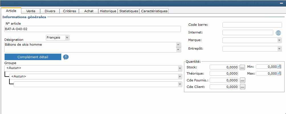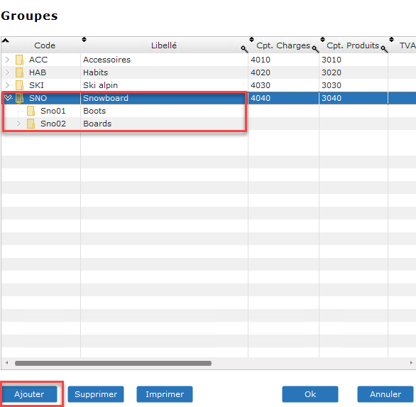 Il est important de créer vos groupes, car lors de la création de vos articles, les valeurs (Cpt charges, produits, TVA,...) de vos groupes seront automatiquement mises par défaut.