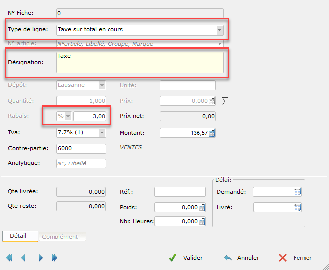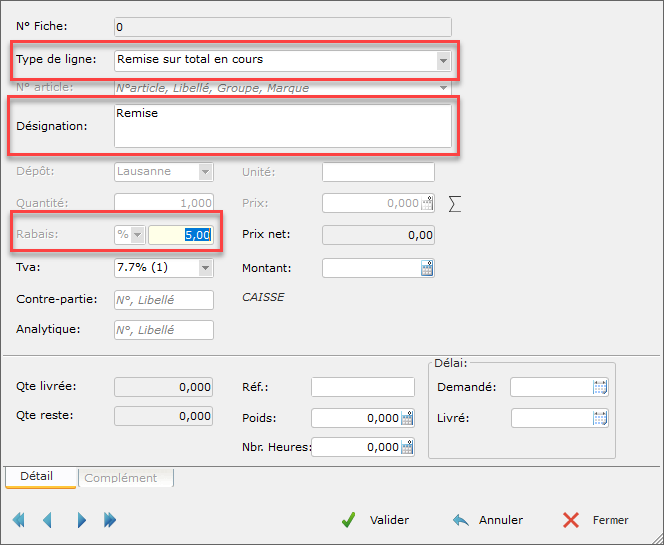 • Dans le champ Type de ligne, choisissez Remise sur total en cours